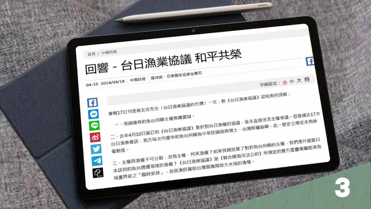 二、去年4月10日簽訂的《臺日漁業協議》是針對臺日漁權的協議,並未直接涉及主權爭議。但是過去17次臺日漁業會談,我方每次均重申釣魚臺列嶼為中華民國固有領土、臺灣附屬島嶼,此一堅定立場從未有絲毫動搖。