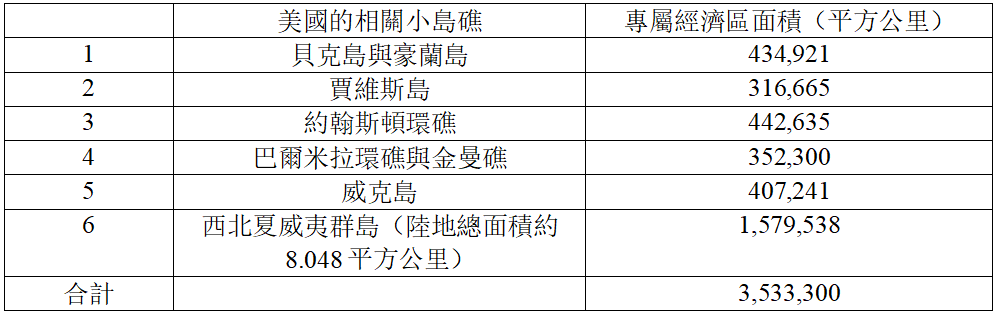 不僅如此,在實踐中,美國對其他無人居住的遠洋島礁,如貝克島(Baker Island)、豪蘭島(Howland Island)、賈維斯島(Jarvis Island)、約翰斯頓環礁(Johnston Atoll)、巴爾米拉環礁(Palmyra Atoll)、中途島(Midway Atoll)、納弗沙島(Navassa Island)、威克島(Wake Island)等島礁,主張200海里的專屬經濟區。其中大部分島礁的自然地理條件還遠不及我國太平島等南沙群島各島。可見,美國對於島礁的界定以及可以享有的海洋權利完全是持雙重標準。14美國本土瀕臨大西洋和太平洋,已經是海洋地理的優越國,卻還要依據太平洋上的無人小島主張200海里的海洋權利。事實上,美國依據太平洋上的6組無人小島(群)主張的專屬經濟區的面積大約353萬平方公里(見下表)15,面積超過整個南中國海的大小。